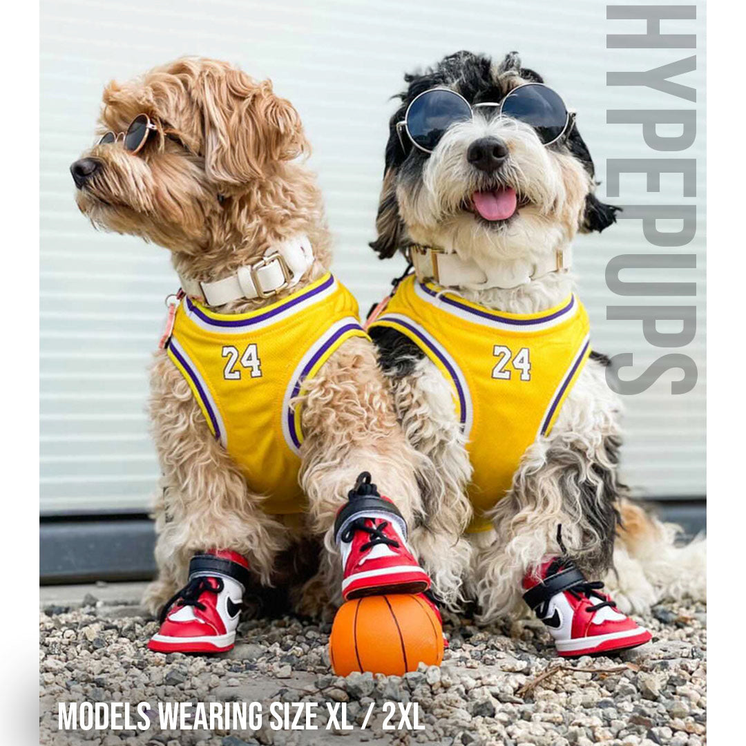 The Air Bud Basketball Jersey brings court culture to your dog’s rotation. Lightweight poly-mesh construction in iconic Lakers yellow and Bulls red colorways, with authentic jersey details that look straight off the court.