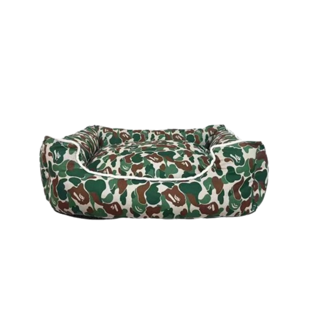 The A Barking Pup Camo Bed brings streetwear style to naptime. Classic camo print in green, brown, and cream with raised edges that create a secure sleeping space and non-slip base that stays put.