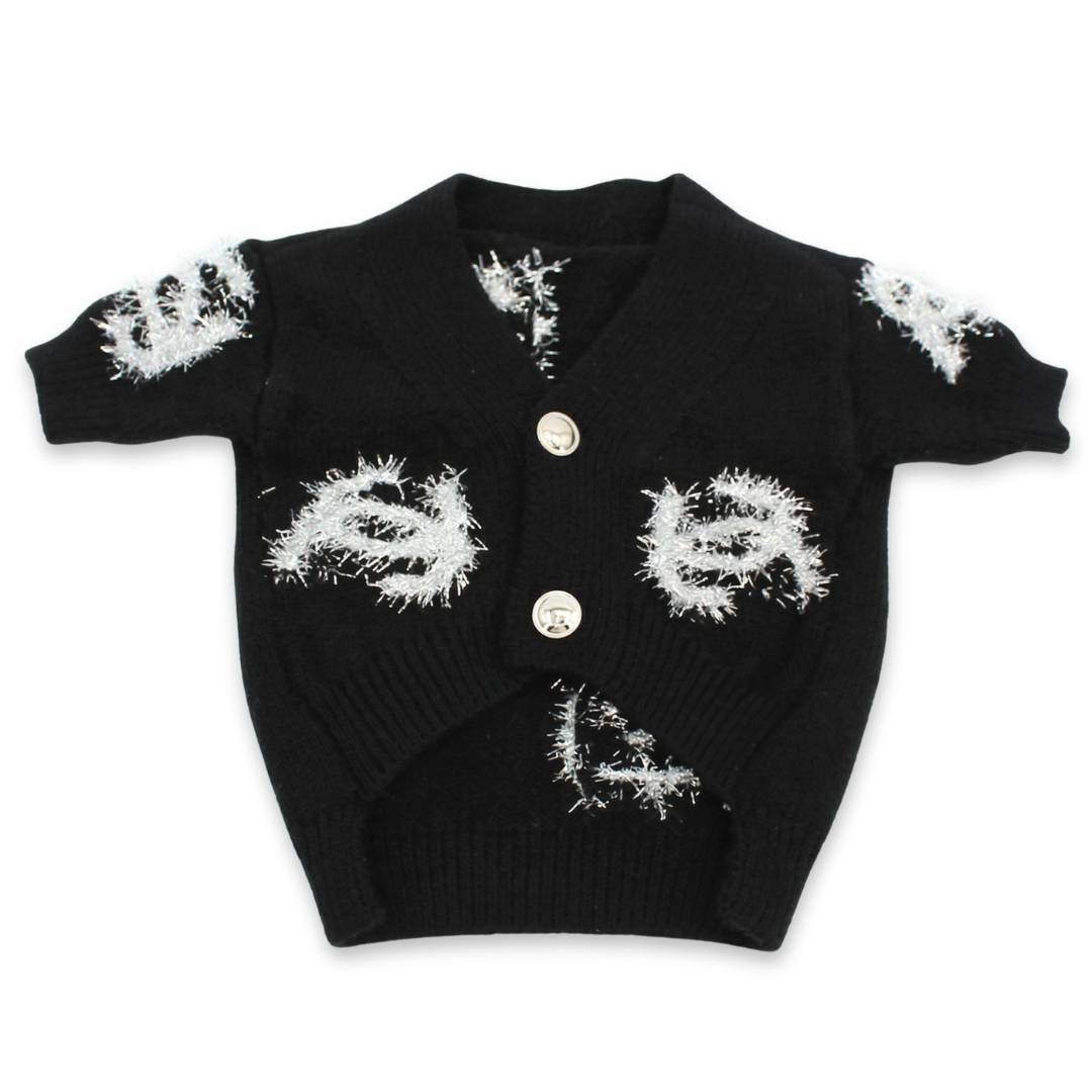 Black knit dog cardigan with white fringe Chanel logo details and gold buttons