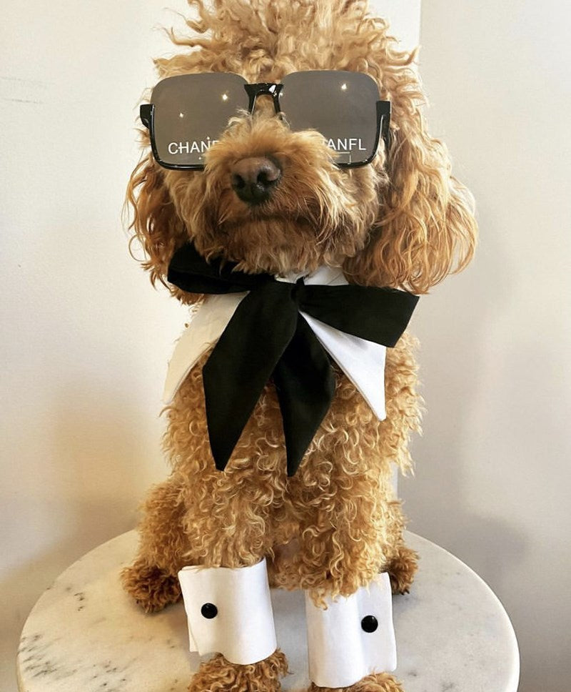 Black frames, dark lenses, Chewnel branding across each lens. The Chewnel Sunglasses give your dog that fashion-editor look without the fashion-editor attitude. Available in black and white colorways.