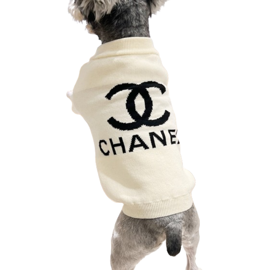 Cream knit with the interlocking CC logo and CHANEL text across the chest. The Chewnel Logo Knit Sweater is clean luxury that works for park walks and photo shoots equally well.