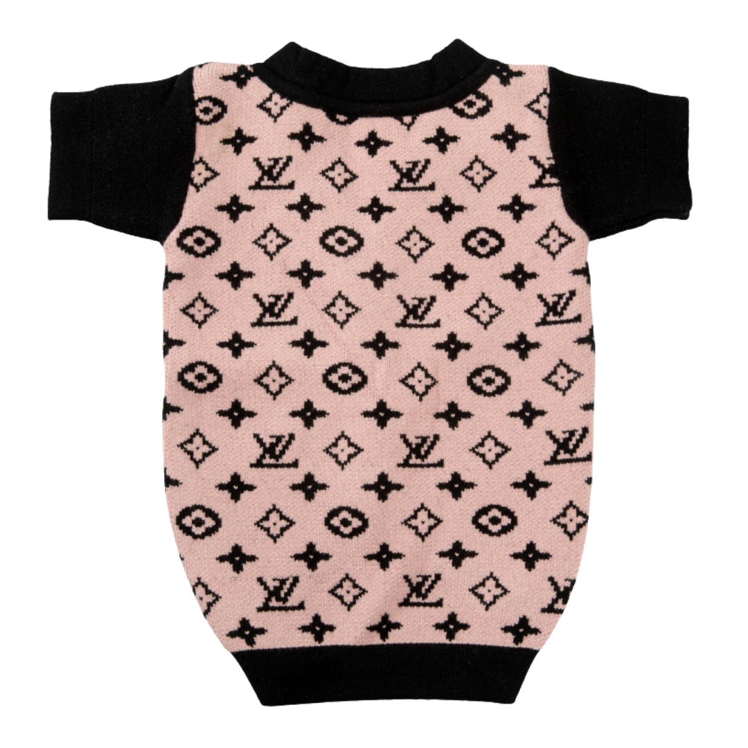 Pink knit dog cardigan with black Louis Vuitton monogram pattern and button front