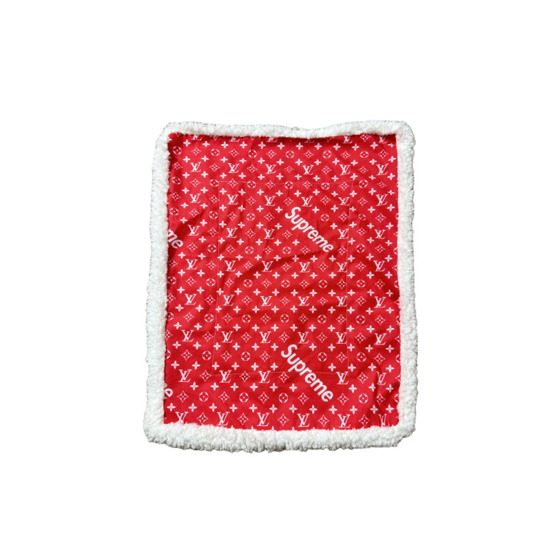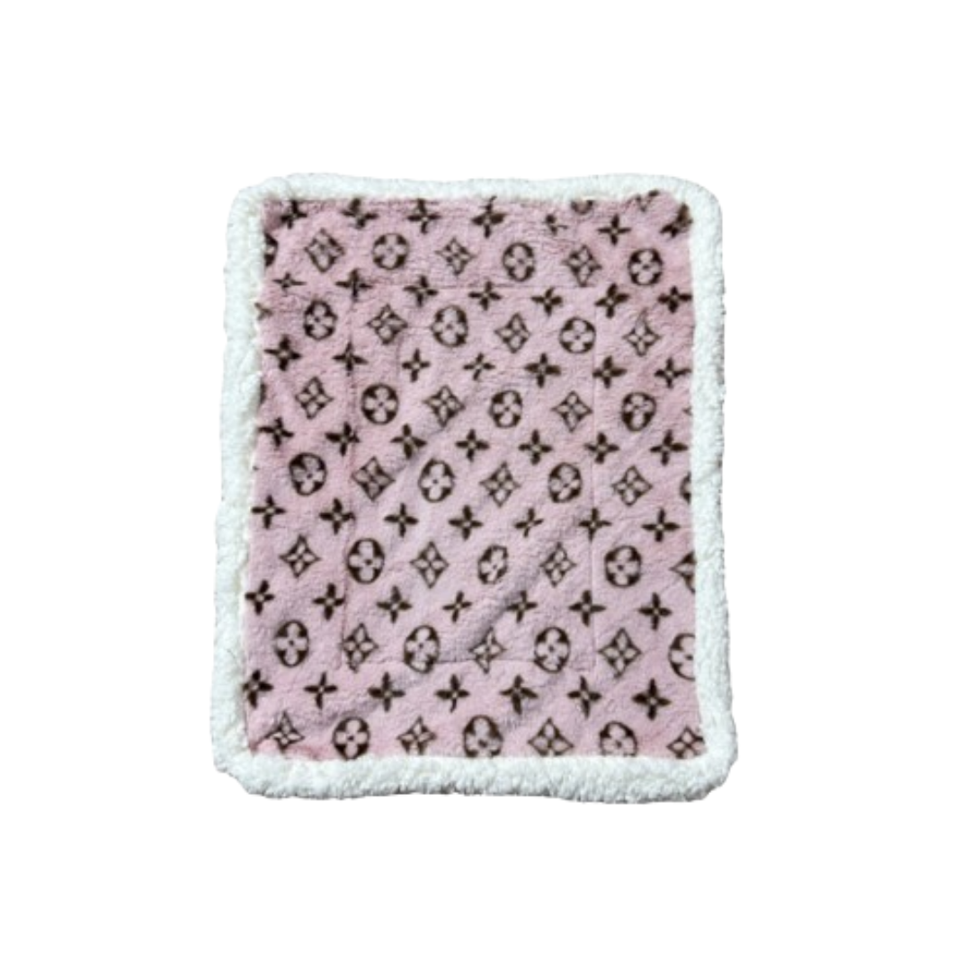 Plush dog bed featuring designer monogram patterns across multiple iconic parody brands. White sherpa border frames each design, creating a luxe sleeping surface that matches your pup’s designer wardrobe.