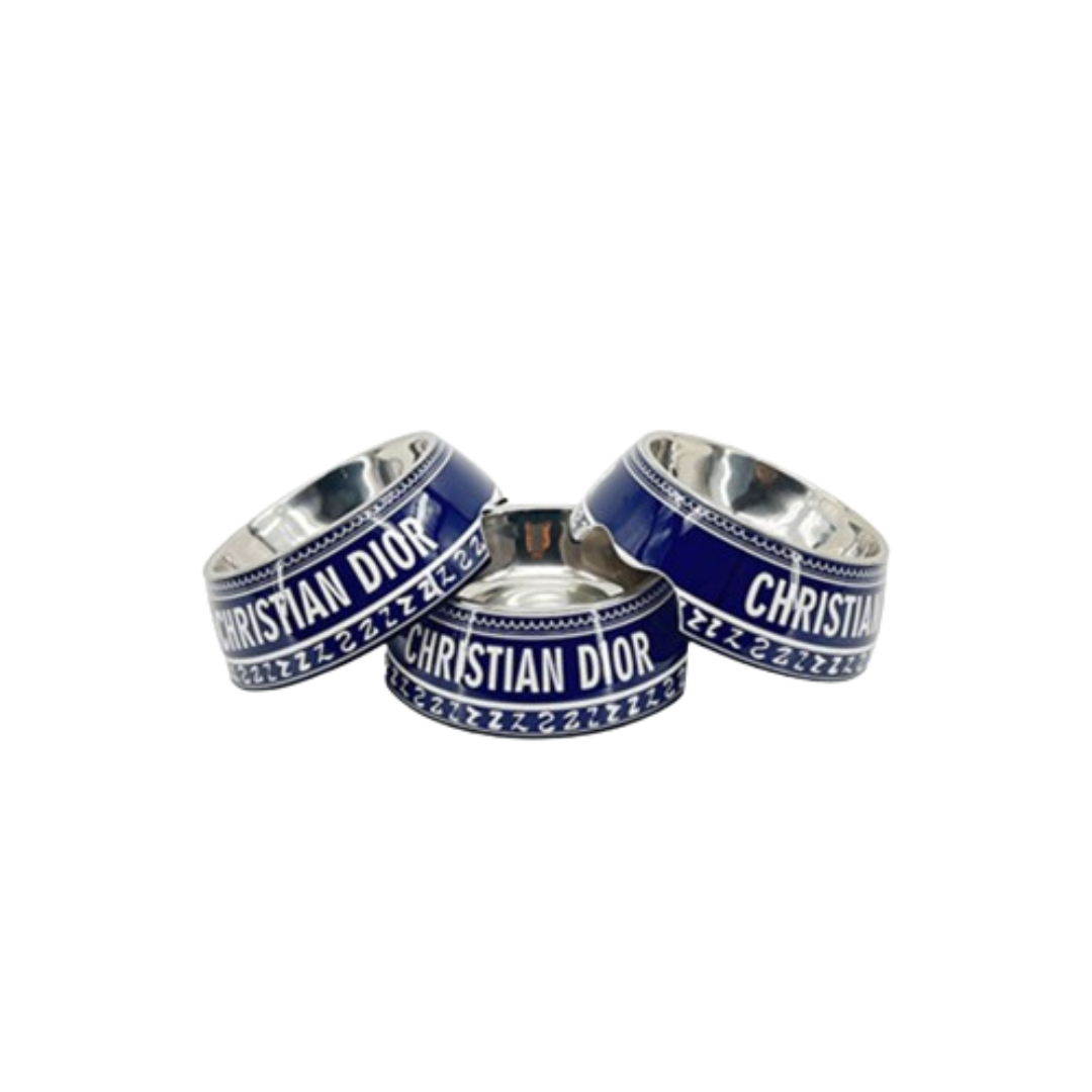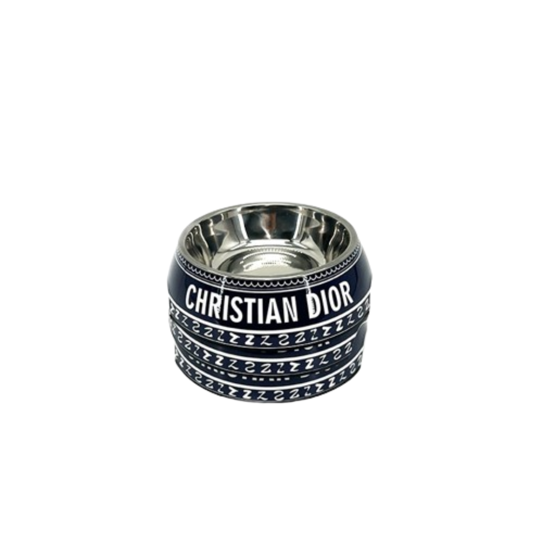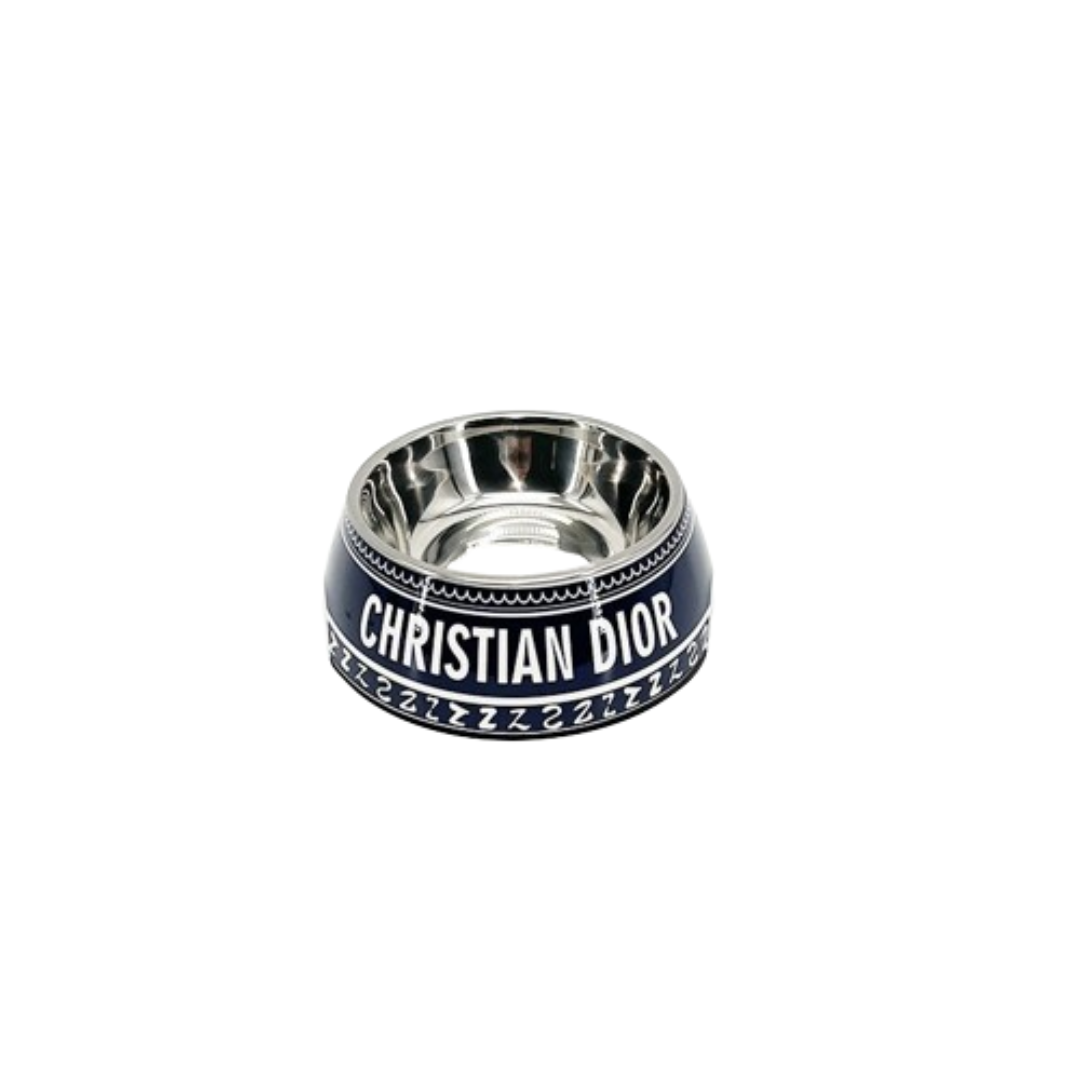 Navy blue designer dog bowl with CHRISTIAN DIOR text and stainless steel interior Dior inspired
