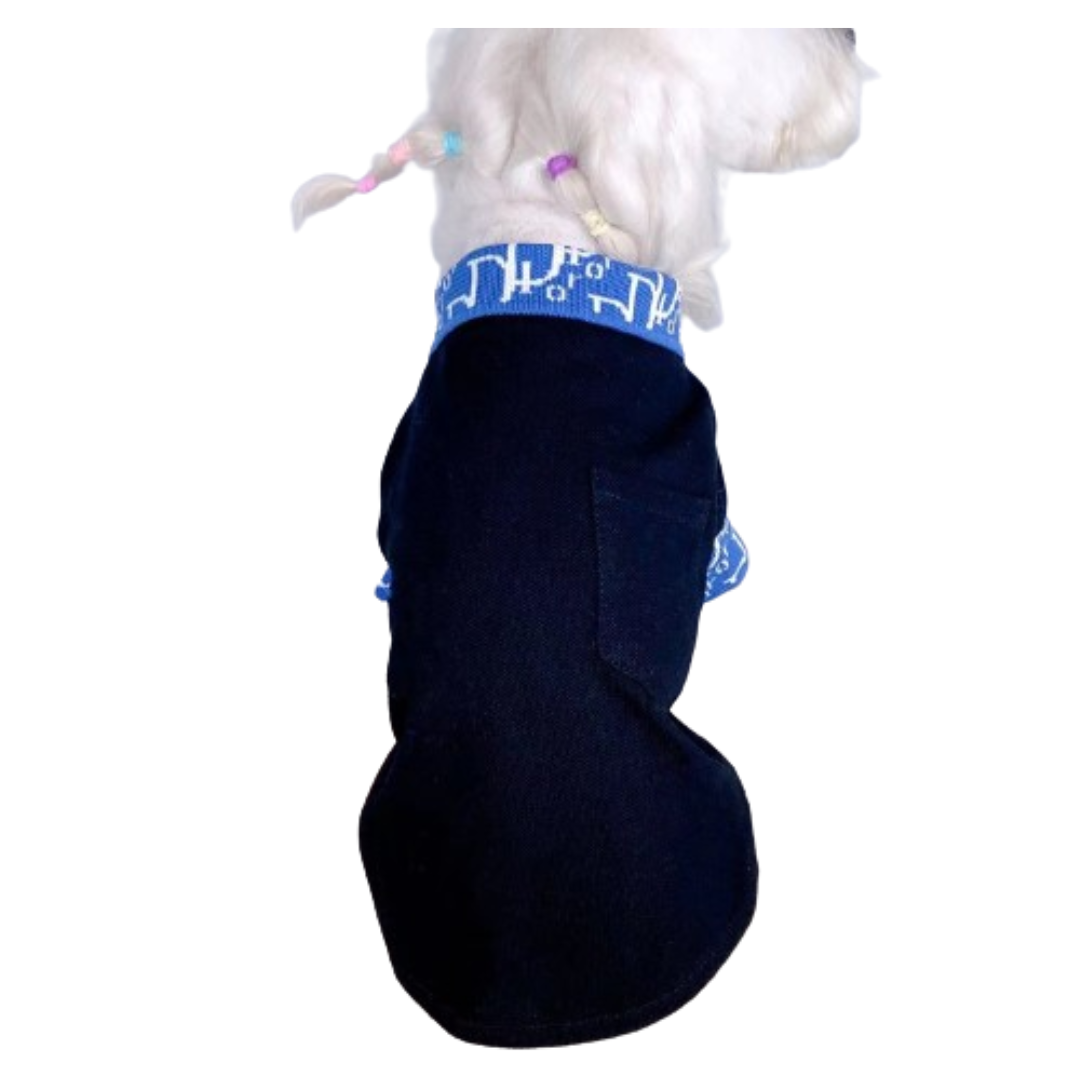 Navy dog polo with blue Dior Oblique print collar and sleeves on white background