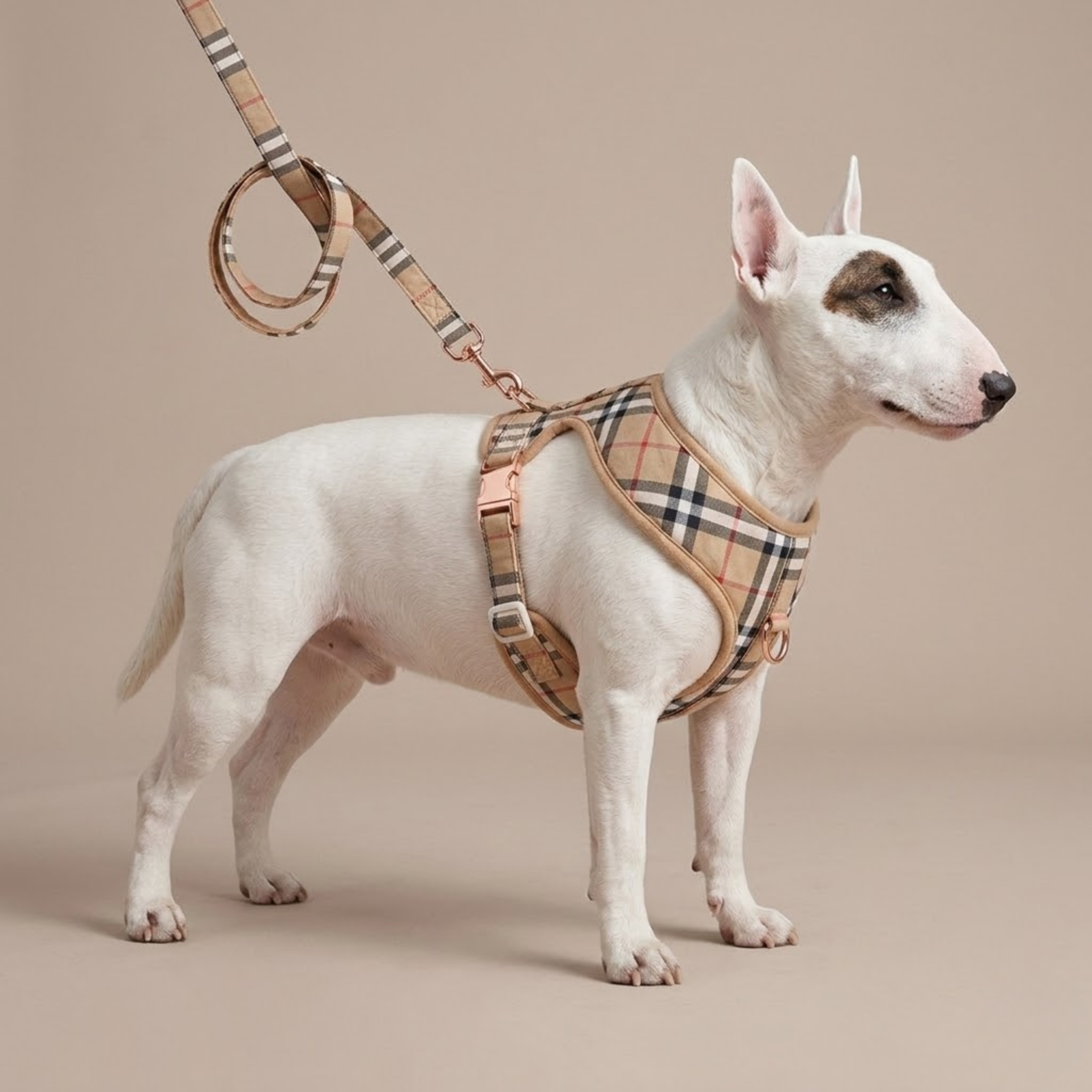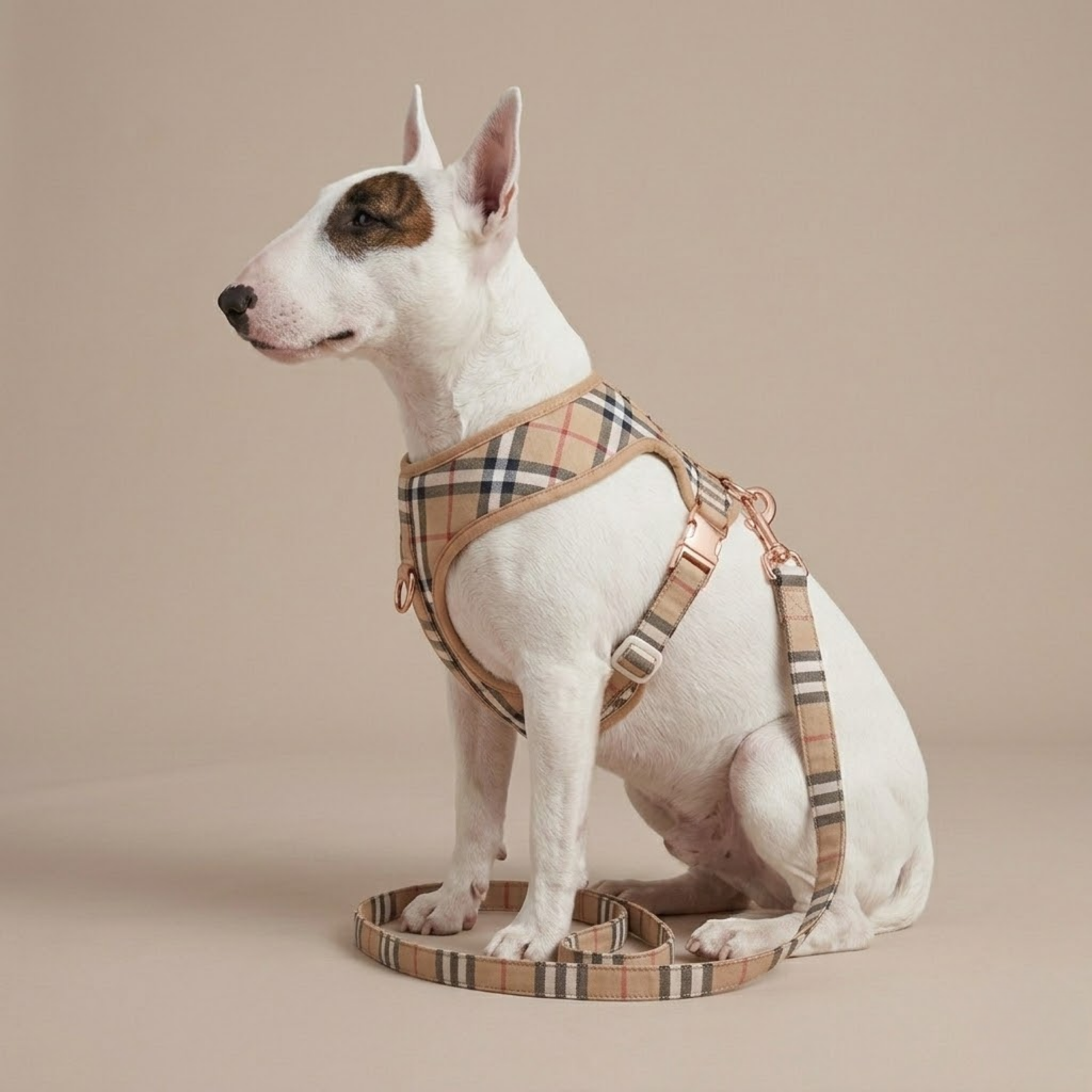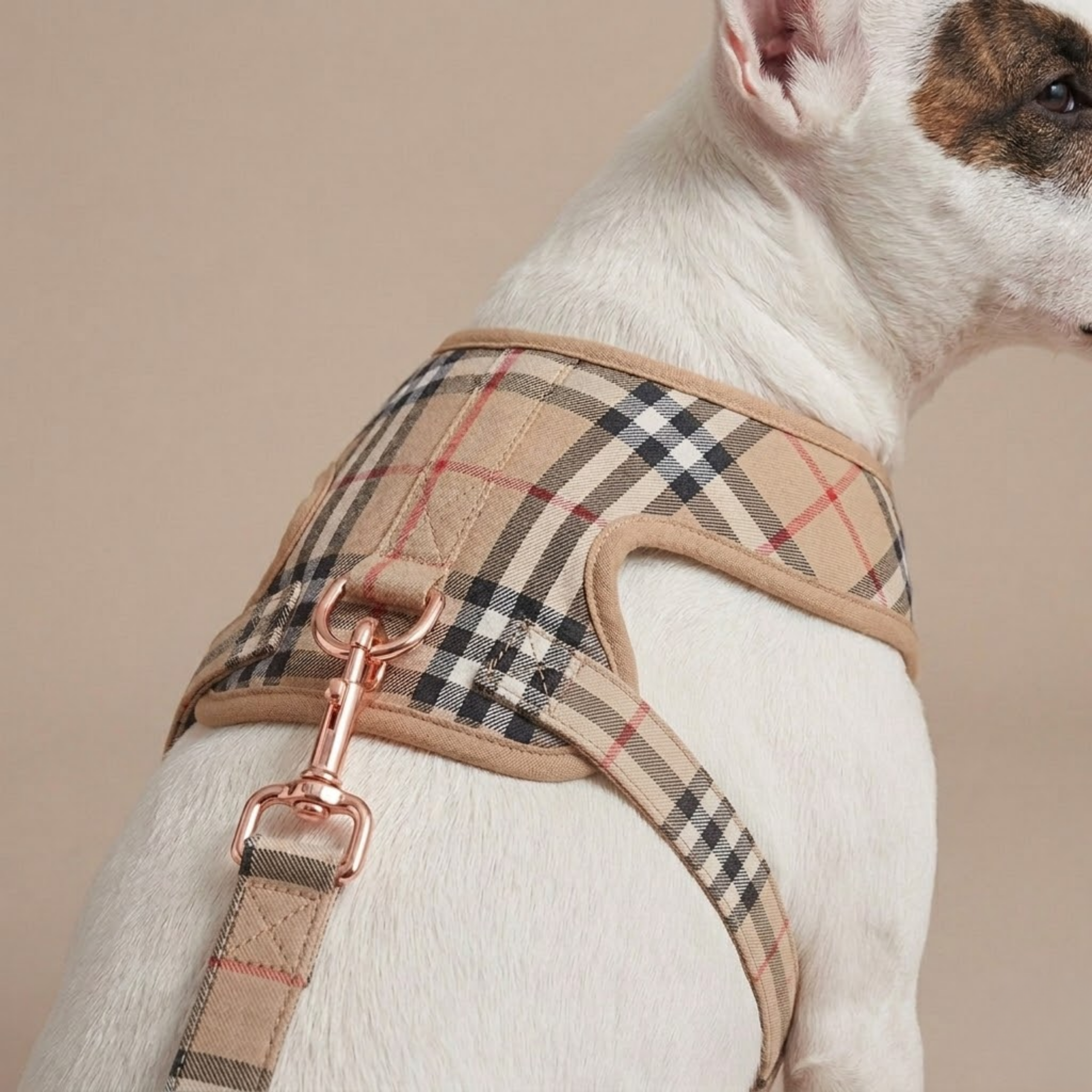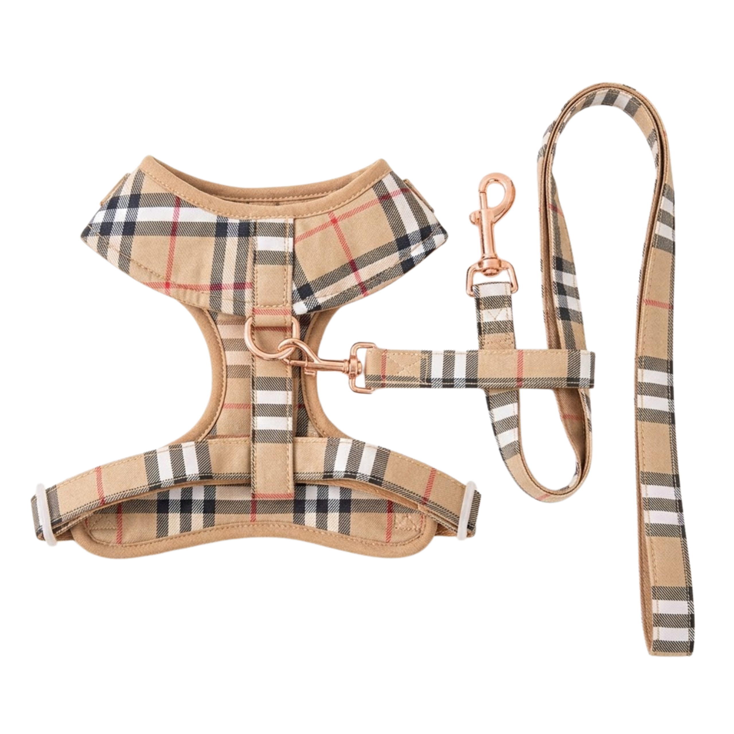 The Furberry Plaid Harness Set brings classic British style to every walk. Classic check pattern in tan, black, and red with gold-tone hardware that looks as good as it performs.