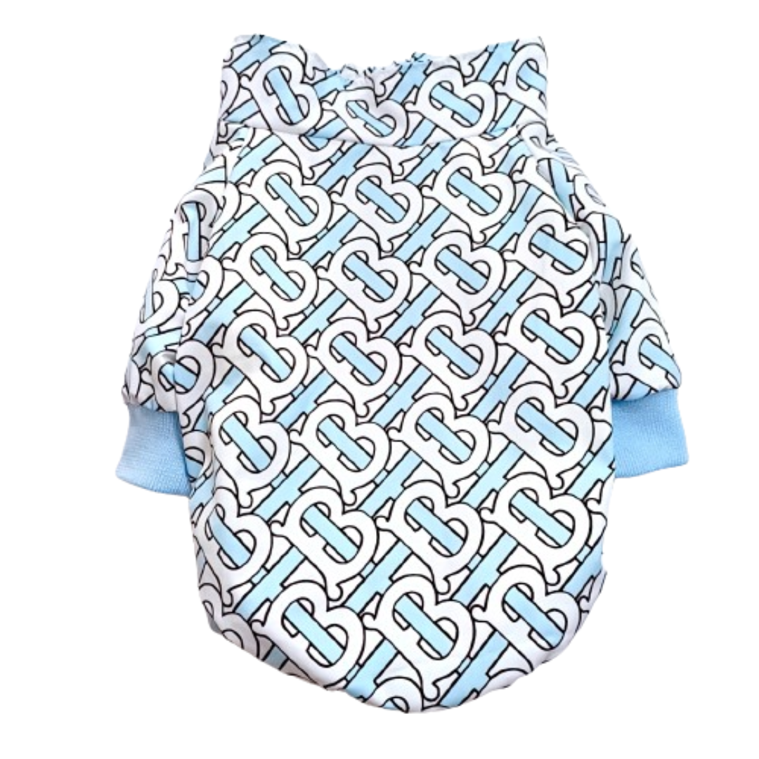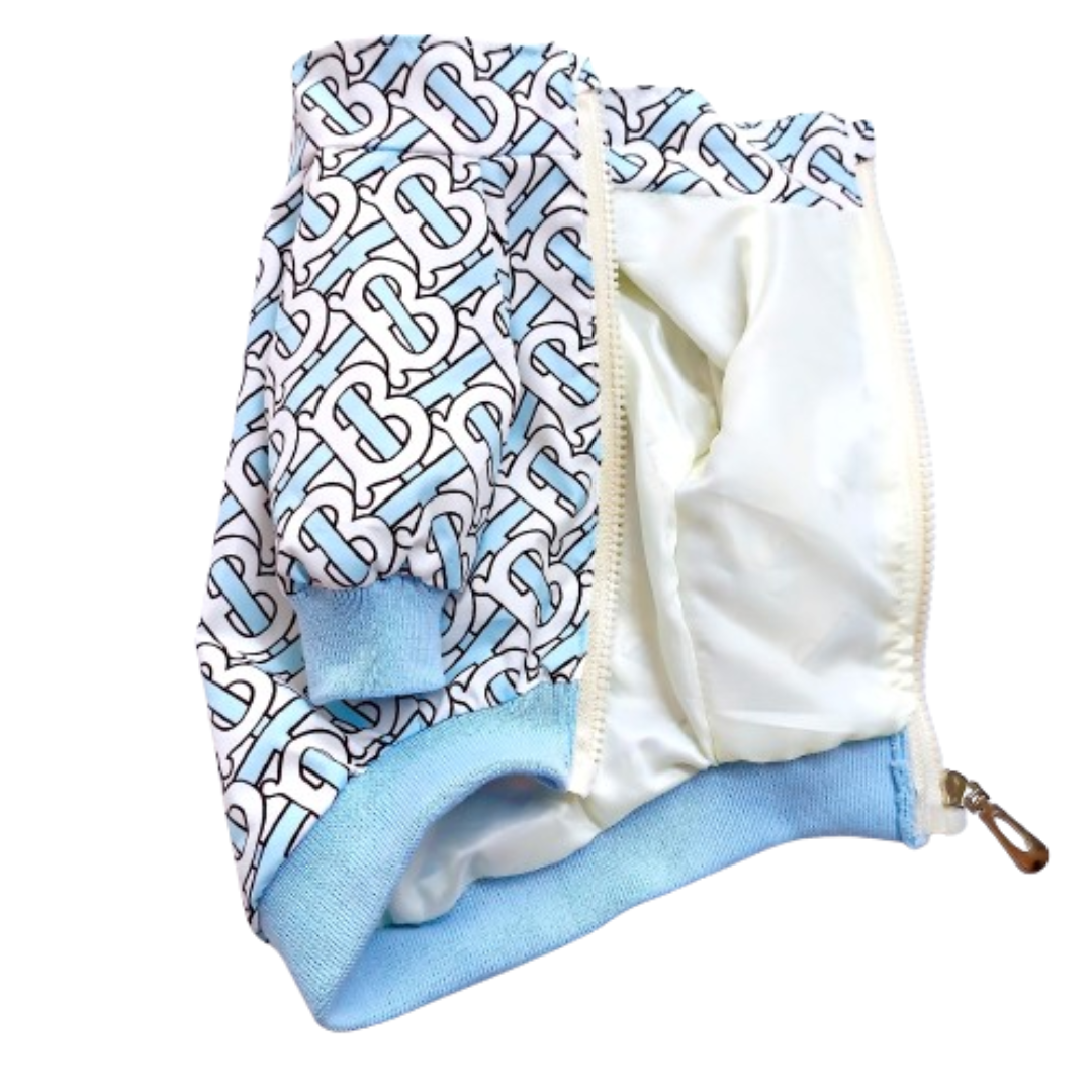 The Furberry TB Monogram Jacket covers the signature interlocking TB print across a structured zip-front jacket. Available in two colorways: blue with light blue accents, coffee with burgundy trim. The kind of piece that makes other dog parents ask where you shop.