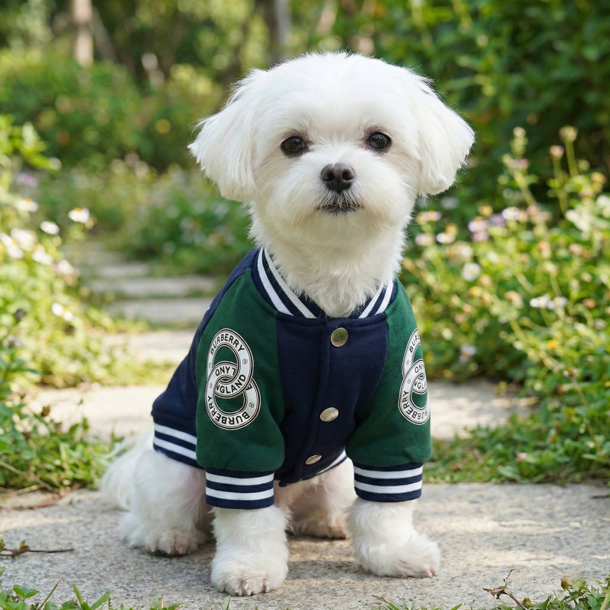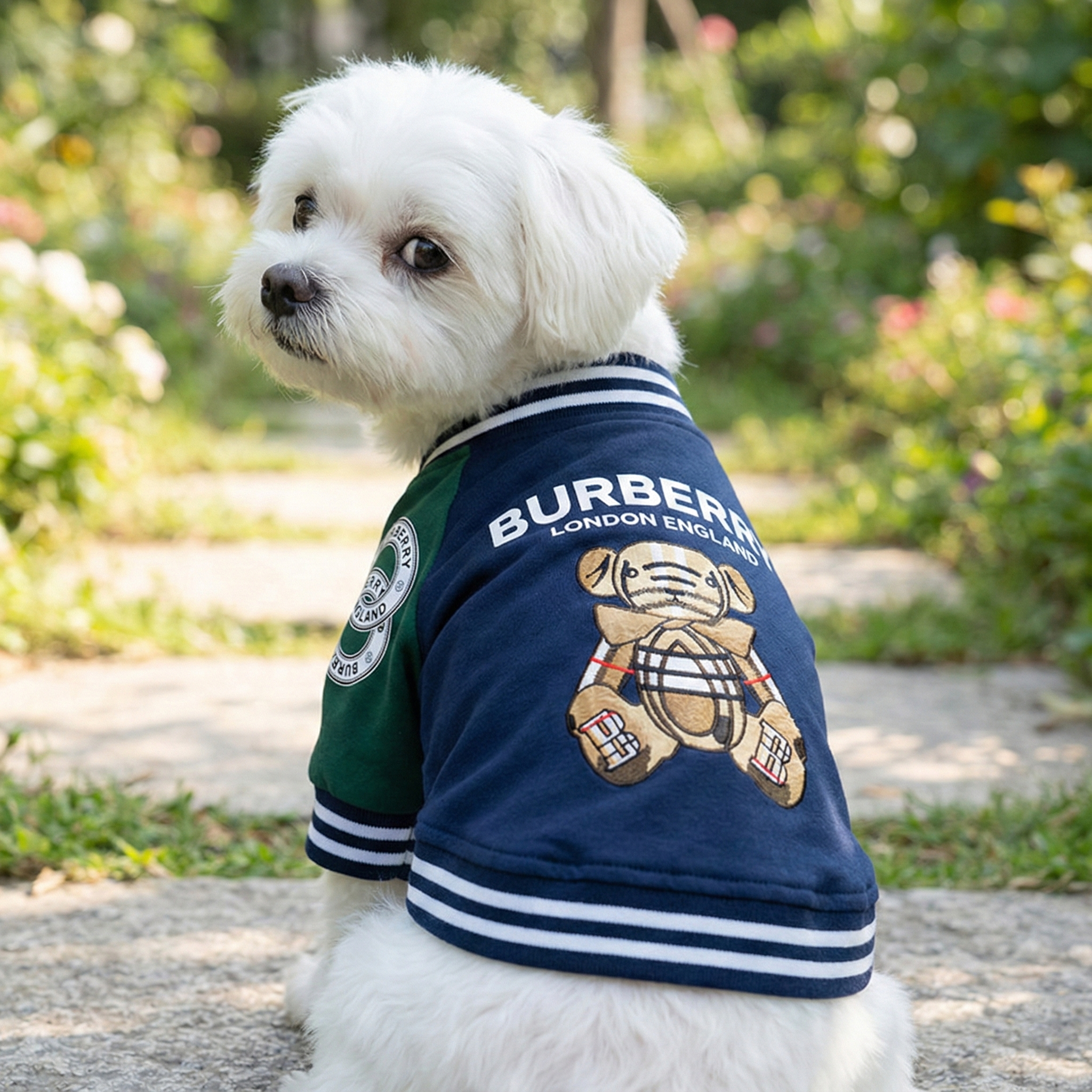 The Furberry Teddy Bear Varsity Jacket puts the classic bear graphic on a classic varsity silhouette. Navy body with green contrast sleeves, white striping at the cuffs and collar, and snap-front closure for that authentic athletic look.