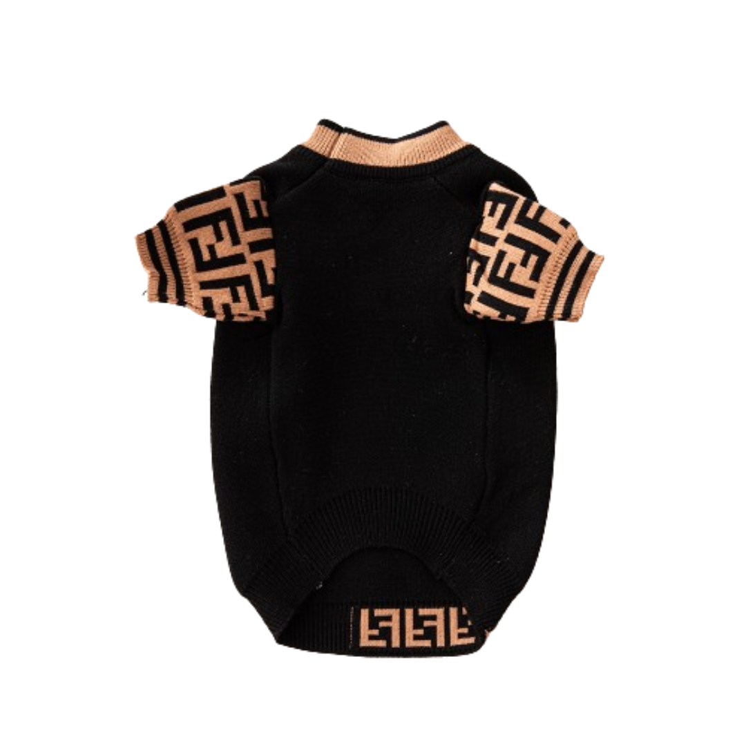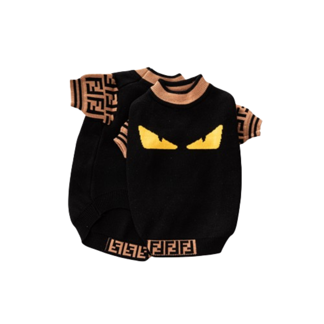 The Furdi Monster Eyes Sweater puts the iconic yellow eye motif on a black knit base with FF monogram detailing at the hem. Ribbed camel-tone collar and sleeve cuffs add contrast, while the knitted construction gives it weight and texture.