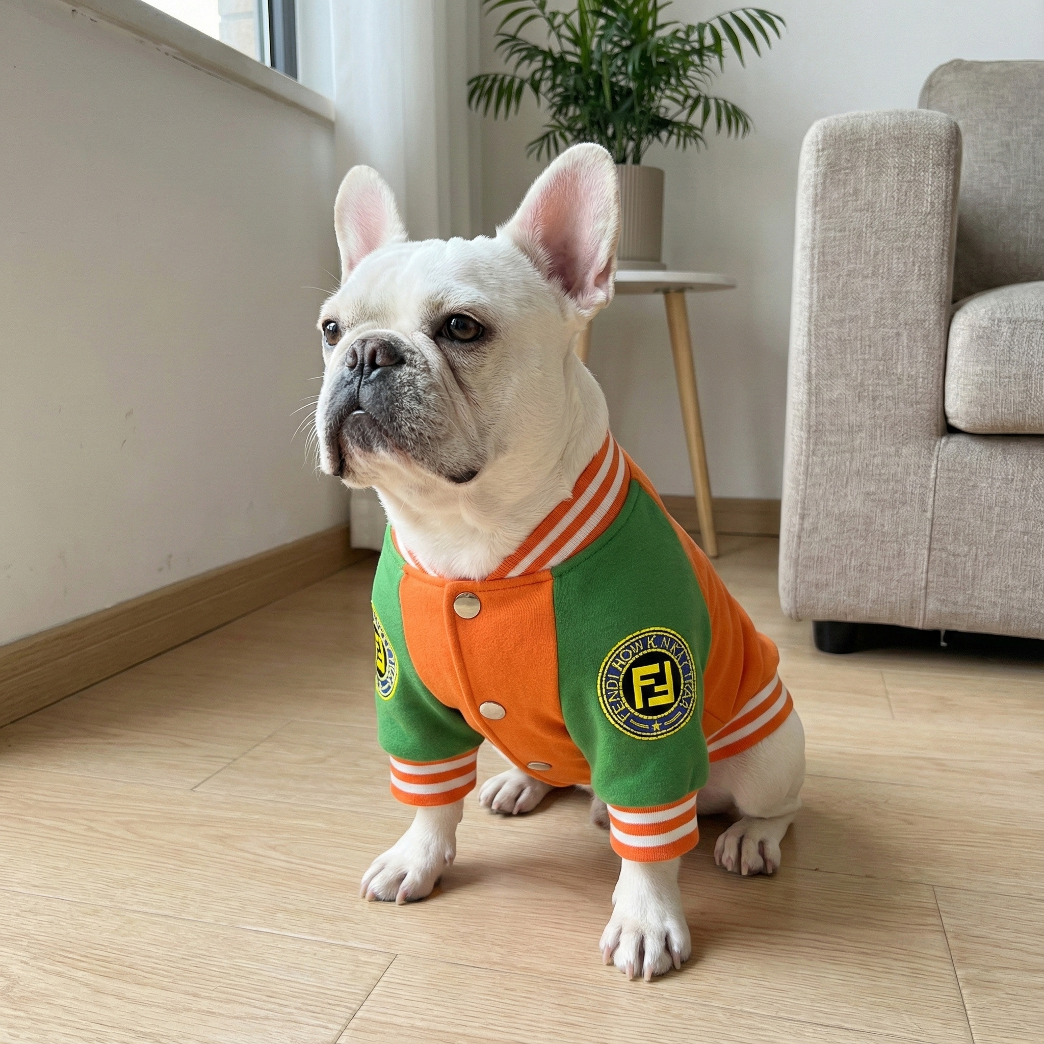 This is the bomber that gets stopped on the street. Orange and green colorway that works on any pup who wants to look like they just stepped off a Milan runway.