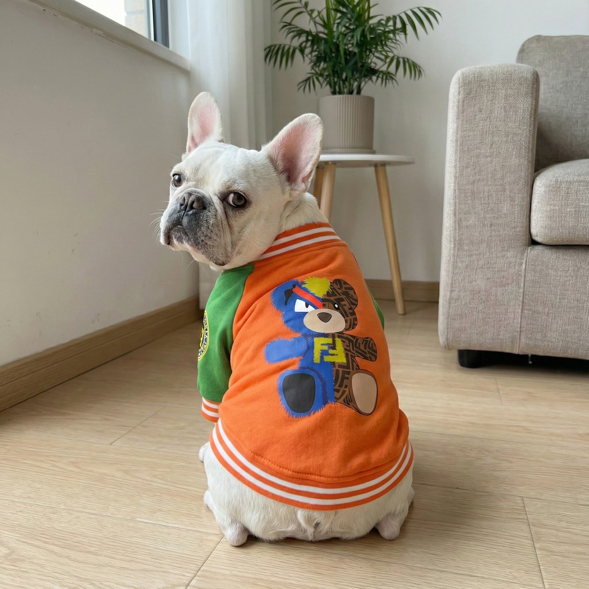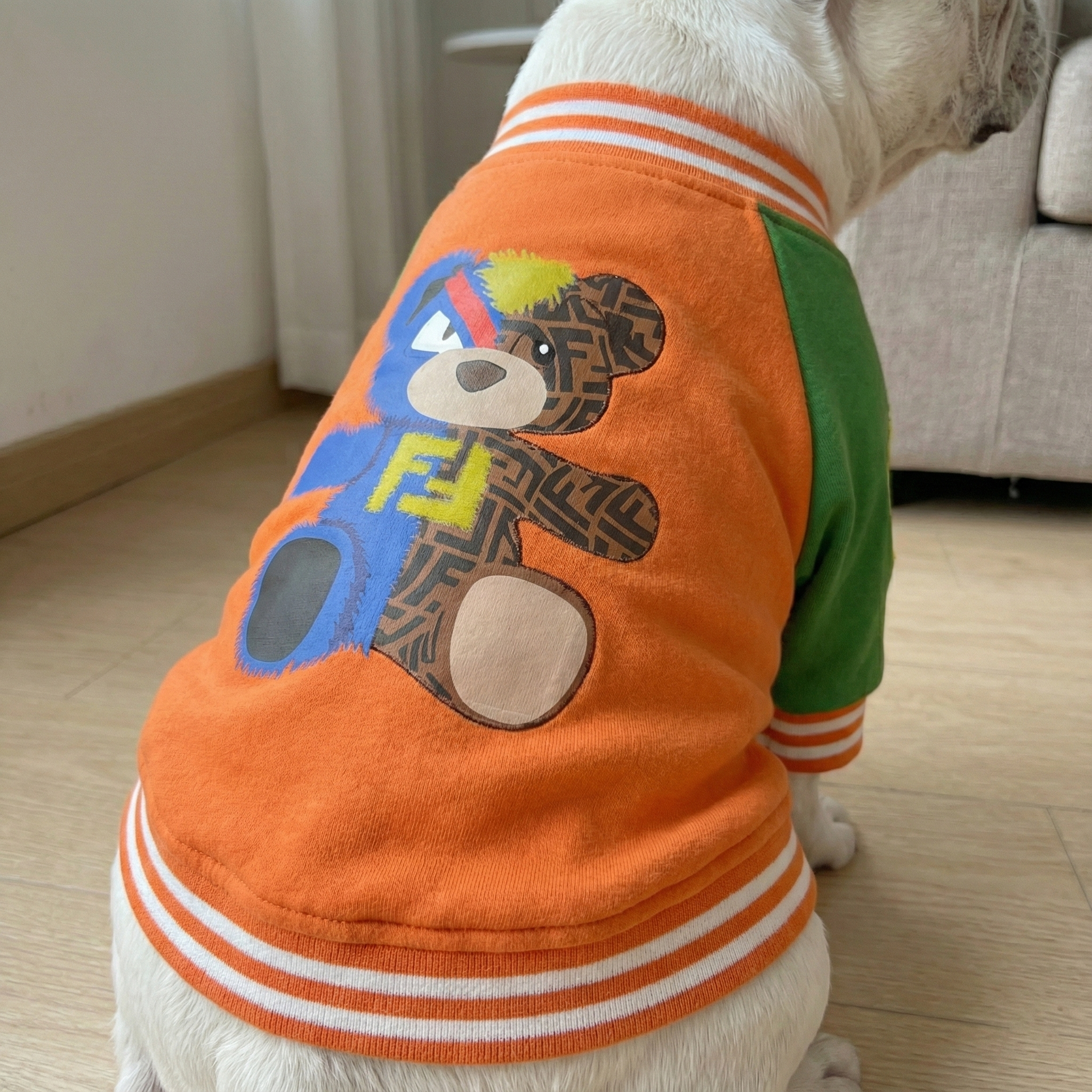 Orange body, green raglan sleeves, and dual FF logo patches on the shoulders. The Furdi Varsity Bomber Jacket puts the split-half teddy bear front and center—half blue streetwear pup, half brown monogram bear.