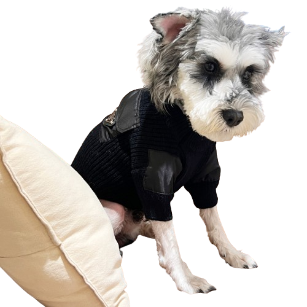 Black ribbed knit dog sweater Prada style with triangle logo pocket flat lay