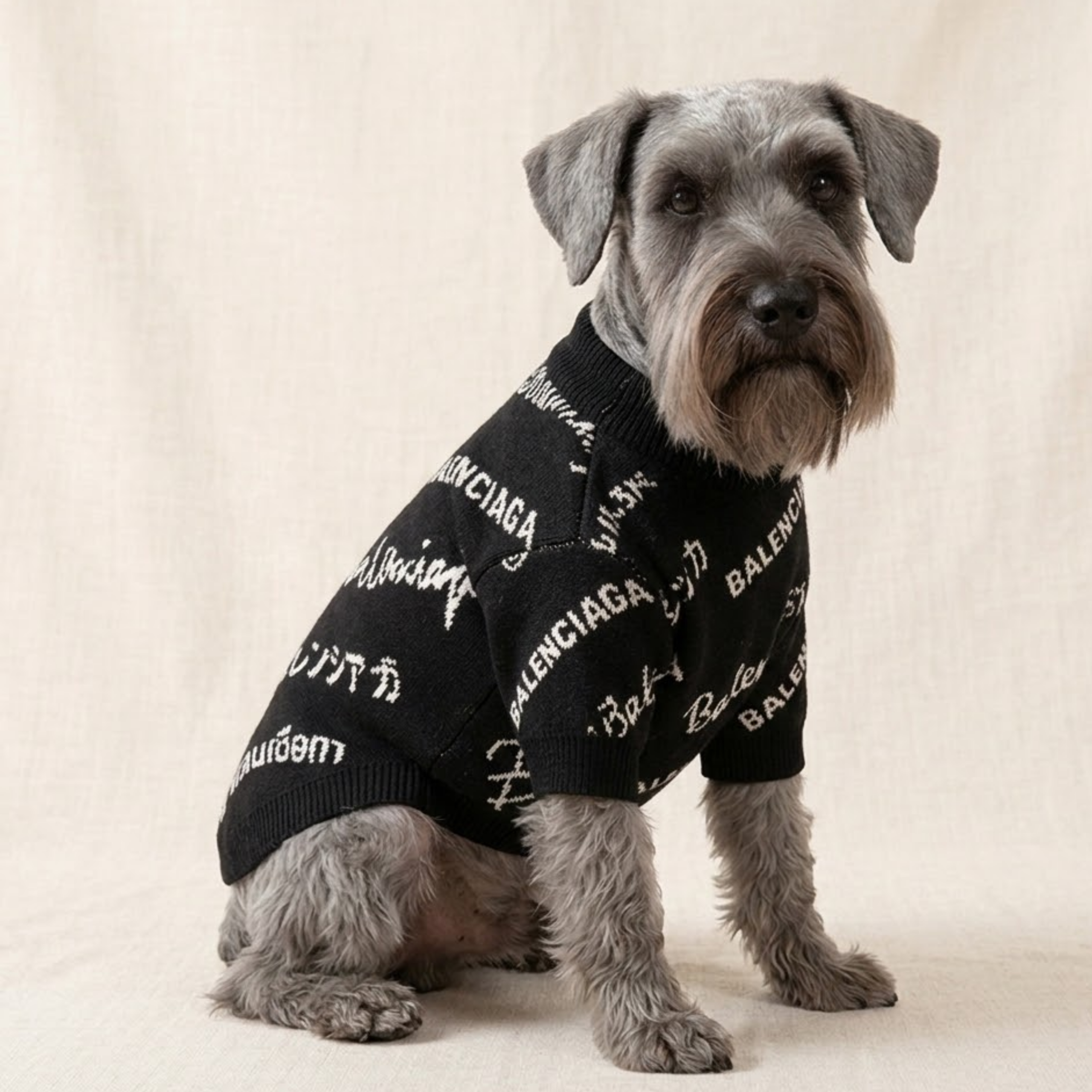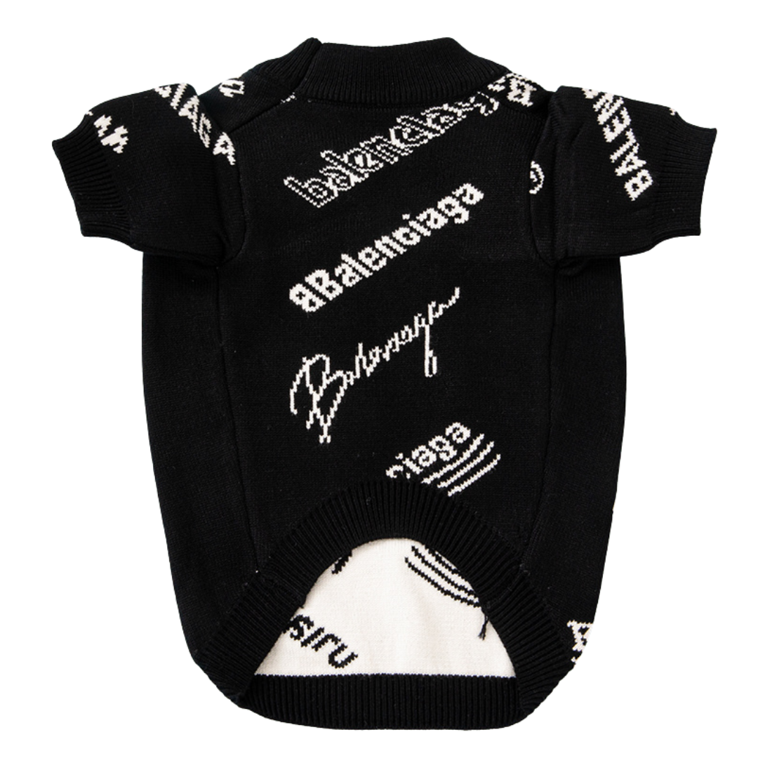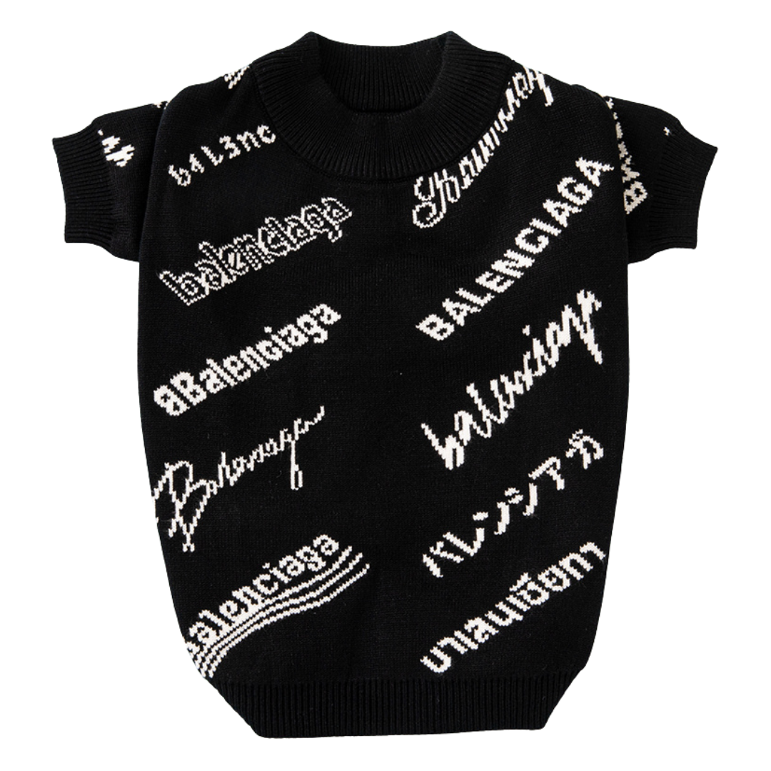 Black knit with scattered white typography across the entire body. The Pawlenciaga Typography Sweater puts the brand’s signature text treatment on a crew neck that works for walks or weekend wear.