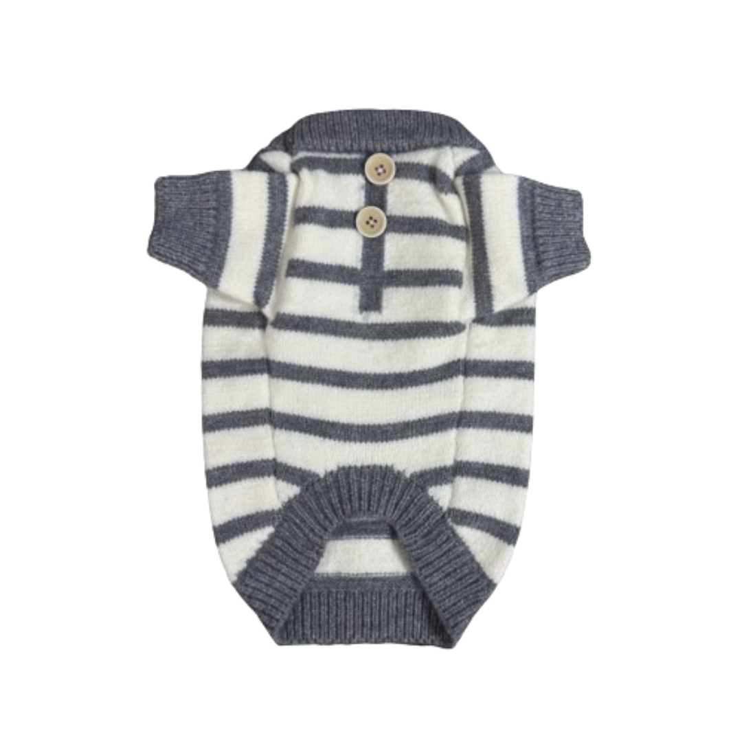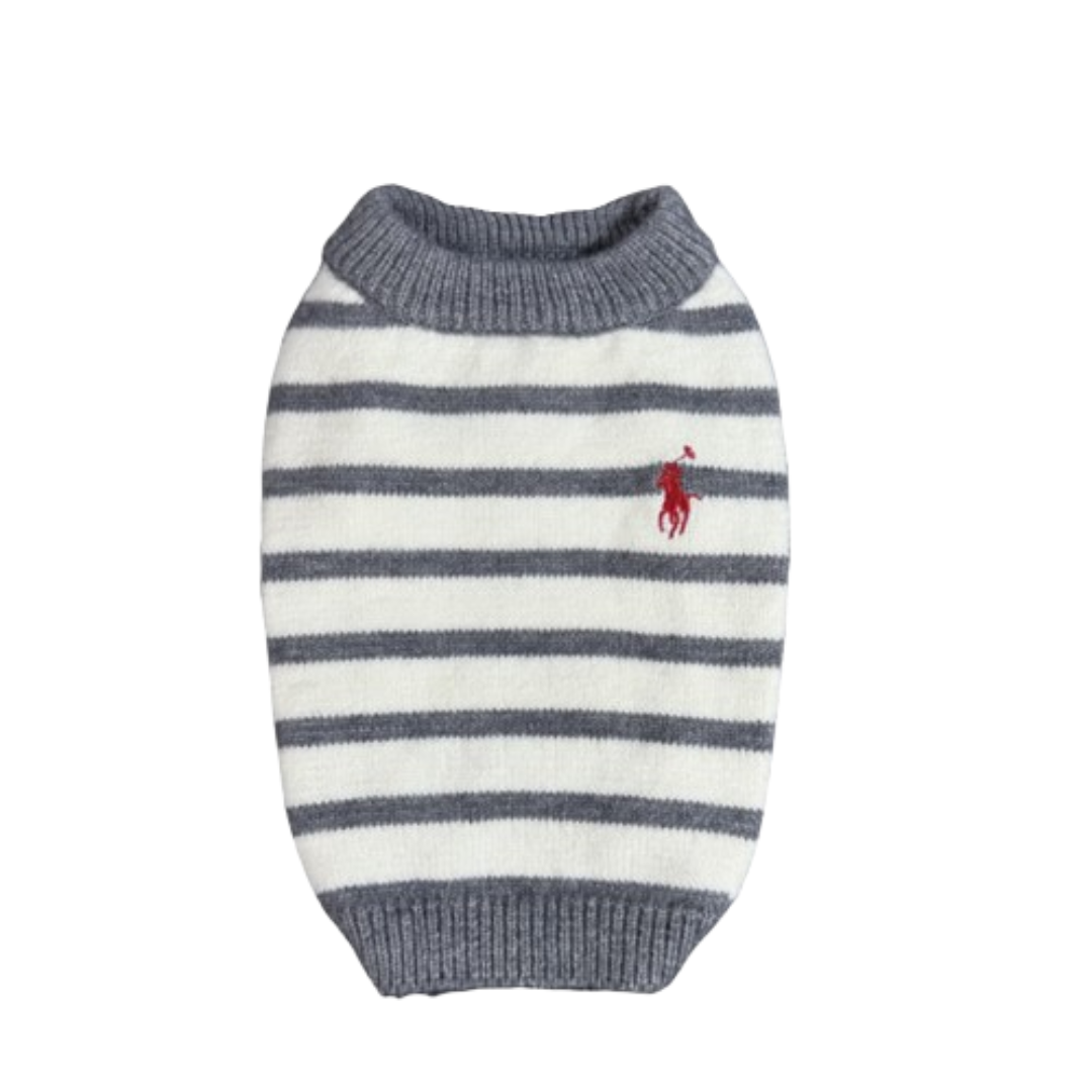 The Pawlo Striped Sweater brings preppy polo style to your dog’s rotation. Gray and cream horizontal stripes with polo-inspired details that reference the classic classic look without trying too hard.