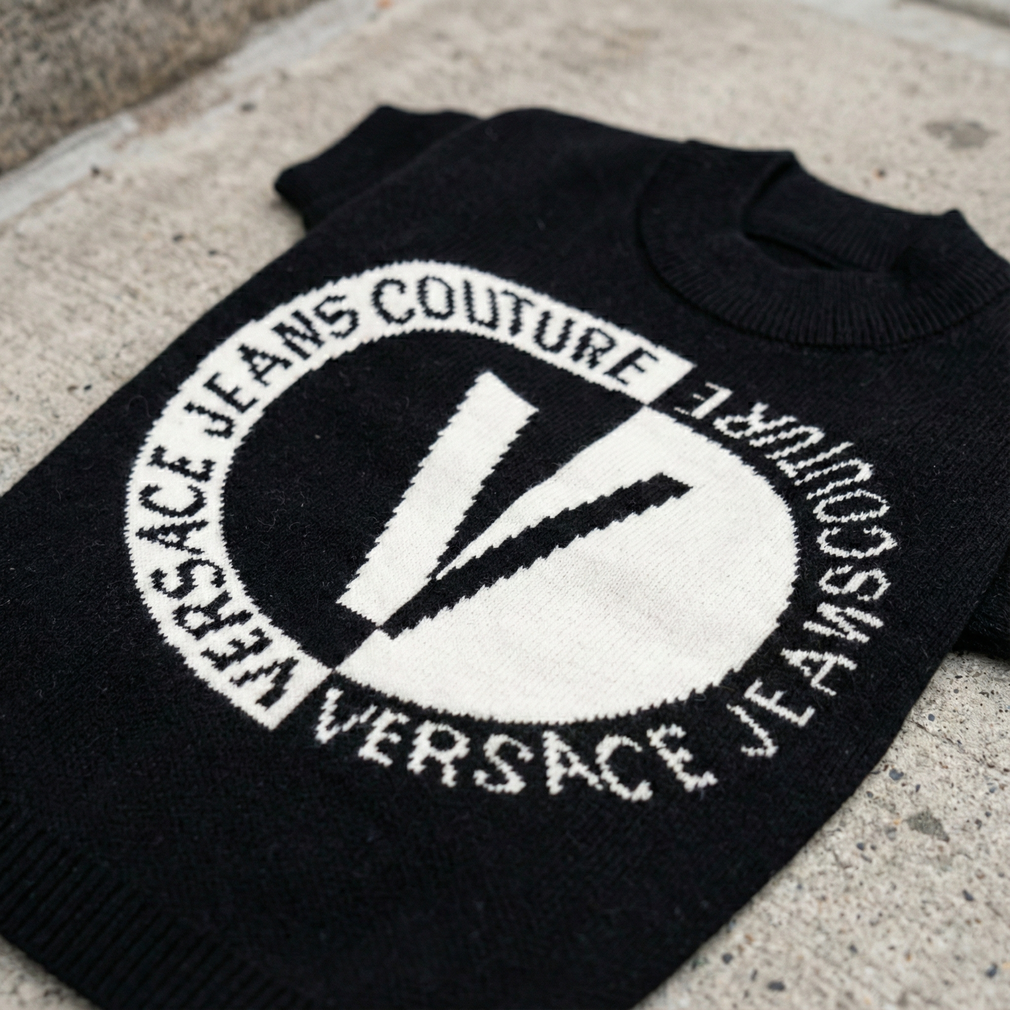 - Large white circle logo with “JEANS COUTURE VERSACE” text around the border