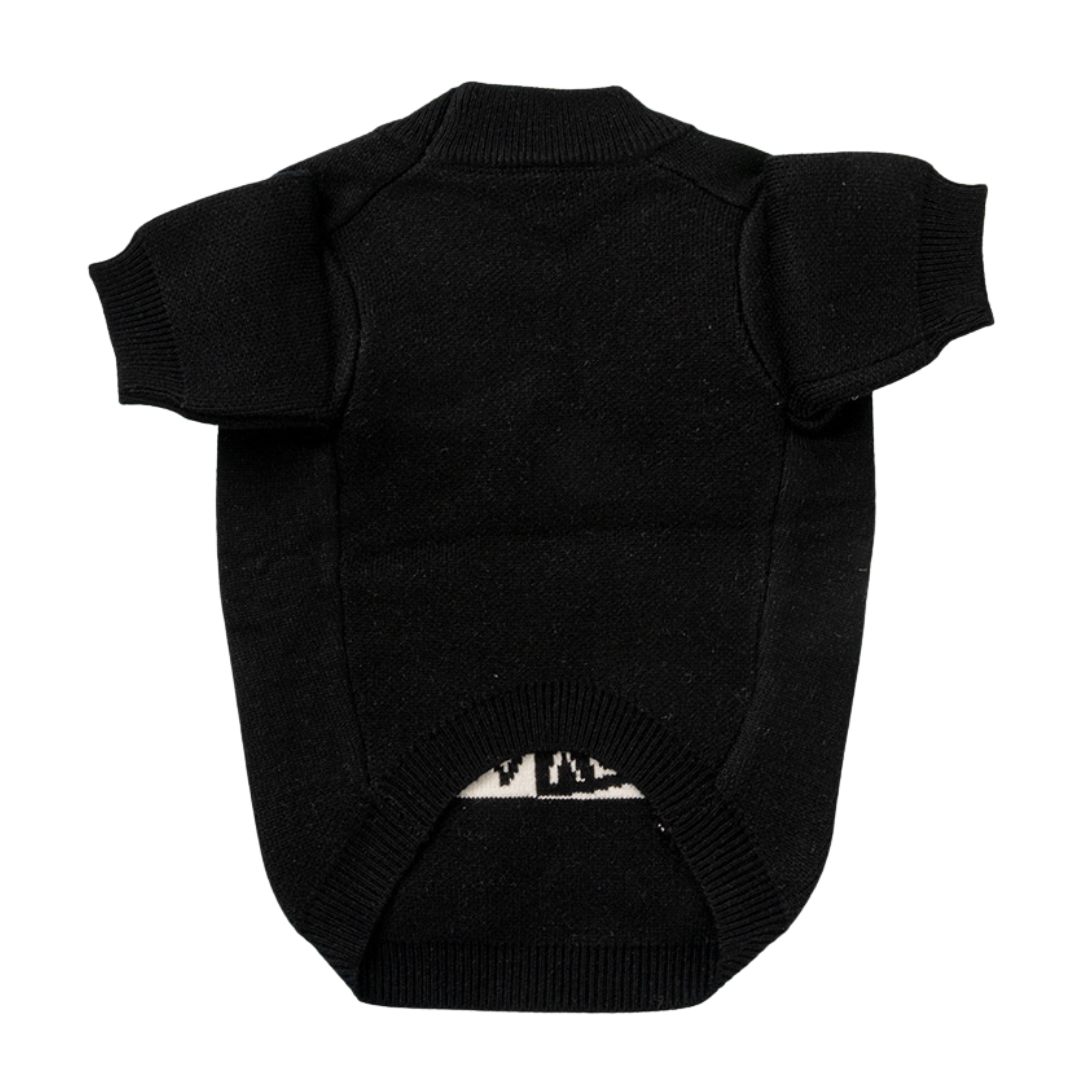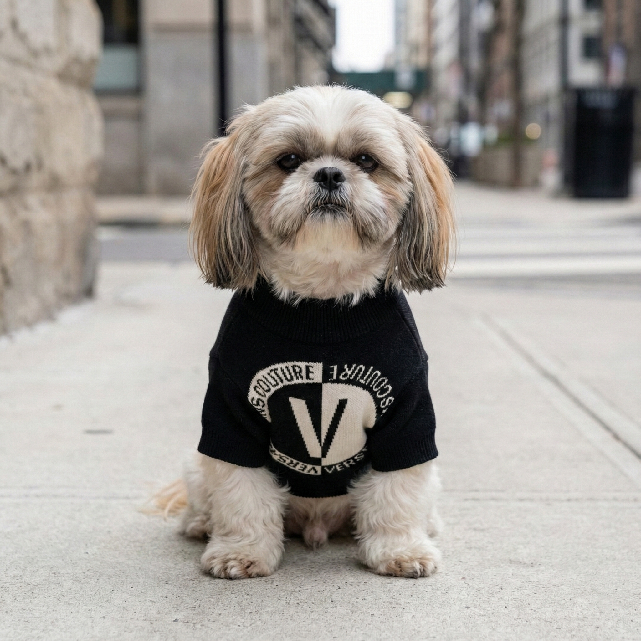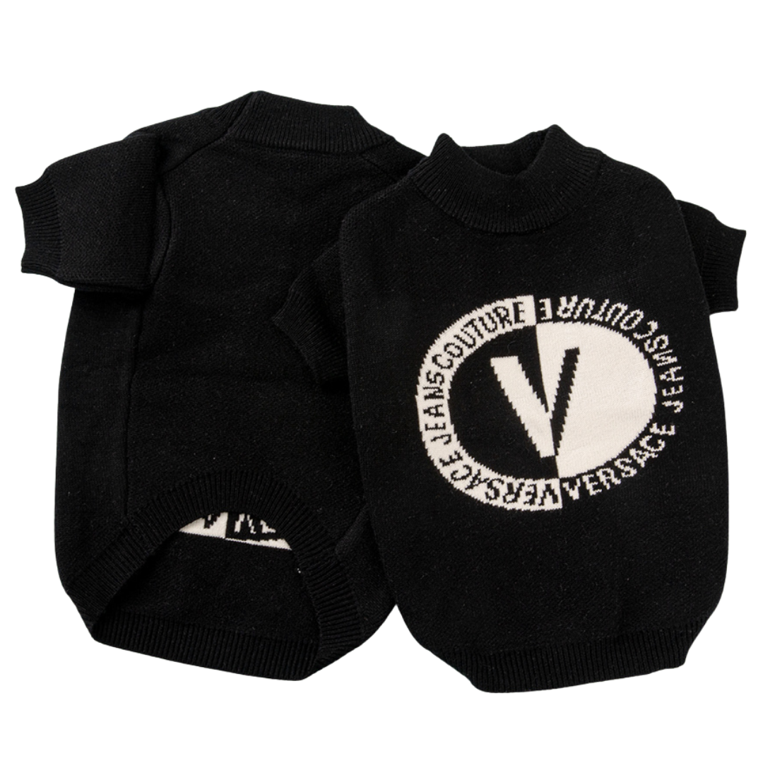 Black knit with a bold white circle logo front and center. The Pawsace Circle Logo Sweater puts the full Versace-inspired branding on a sweater that works for photos and everyday wear.