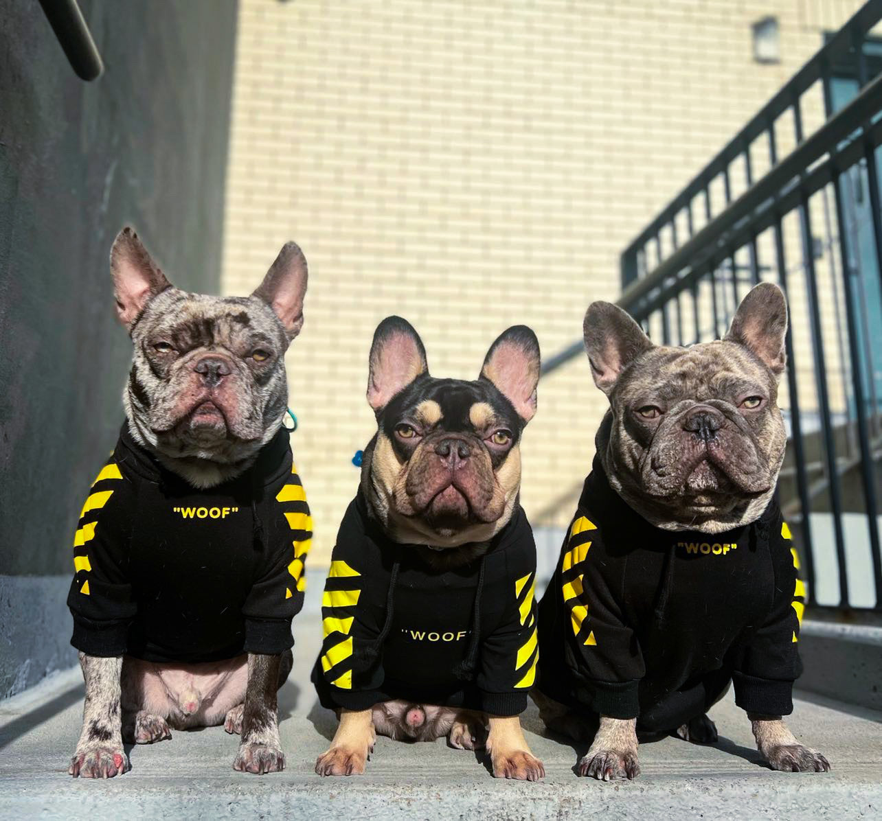 Black base with yellow arrow graphics on the back and diagonal stripe details on the sleeves. The Woof-White Arrow Hoodie brings industrial streetwear design to your dog’s rotation with signature arrow motifs and “WOOF” text placement.