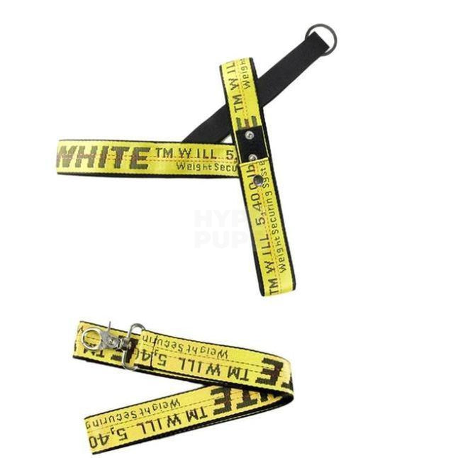 The Woof-White Industrial Harness & Leash Set puts the signature industrial tape aesthetic on functional walking gear. Yellow webbing with black OFF-WHITE text, secure buckles, and matching leash that looks like it came straight from a streetwear drop.