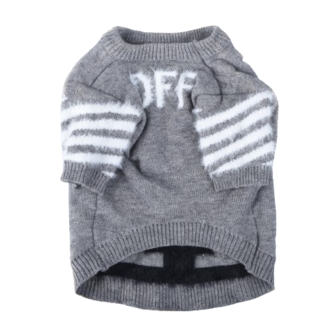 The Woof-White OFF Sweater brings that industrial streetwear energy to a cozy knit. Gray base with bold white OFF lettering across the chest, plus striped sleeves that make the whole piece pop.