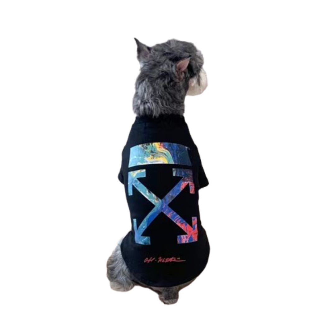 The Woof-White Tropical Galaxy Tee brings Off-White’s signature industrial aesthetic to your dog’s streetwear rotation. Black base with tropical galaxy graphics filling the arrow logo and signature text placement that makes the reference unmistakable.